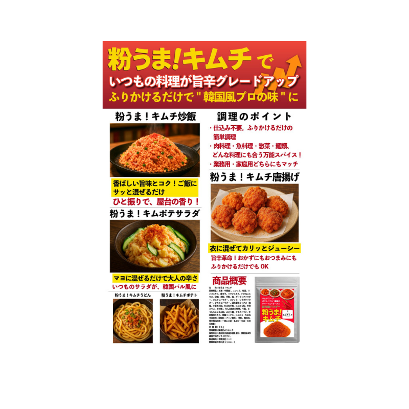 「粉うま!キムチ」は、キムチのコクと旨味、ほどよい辛さをぎゅっと凝縮した万能調味パウダーです。